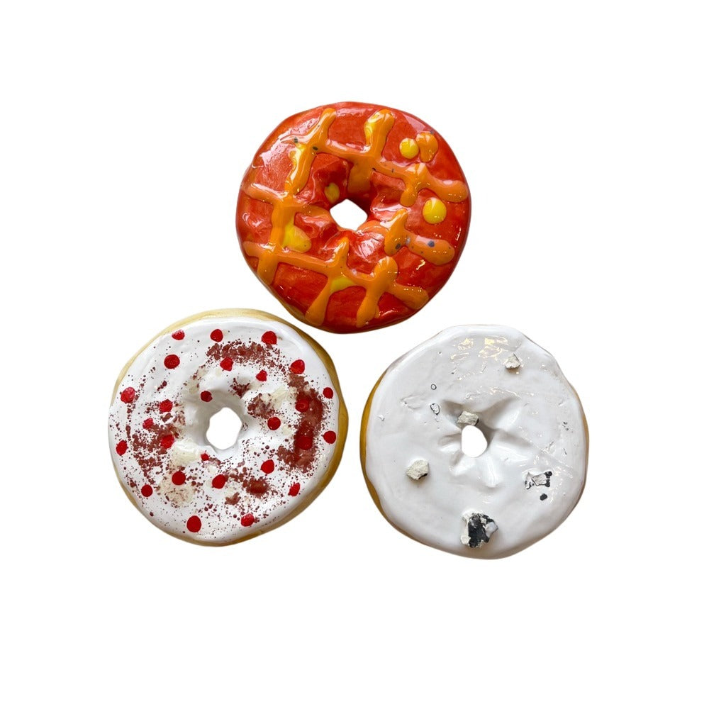 Jeff Nebeker's ceramic donuts are hand made by the artist, are one-of-a-kind, and may vary slightly from the picture. Each donut is stamped with the artist's signature and has a metal hanger glued to the back so it can easily be hung on a wall or displayed flat.