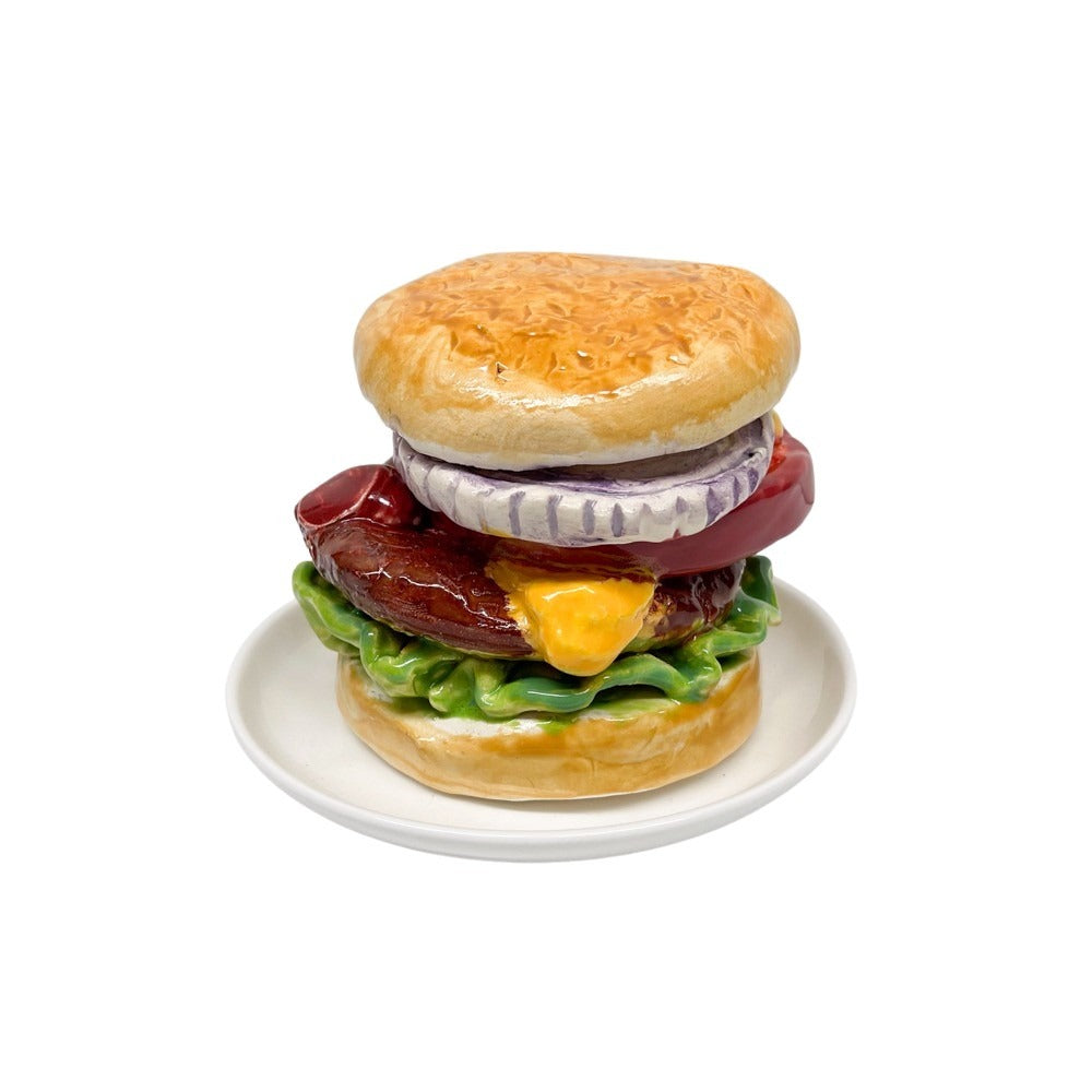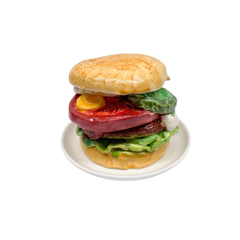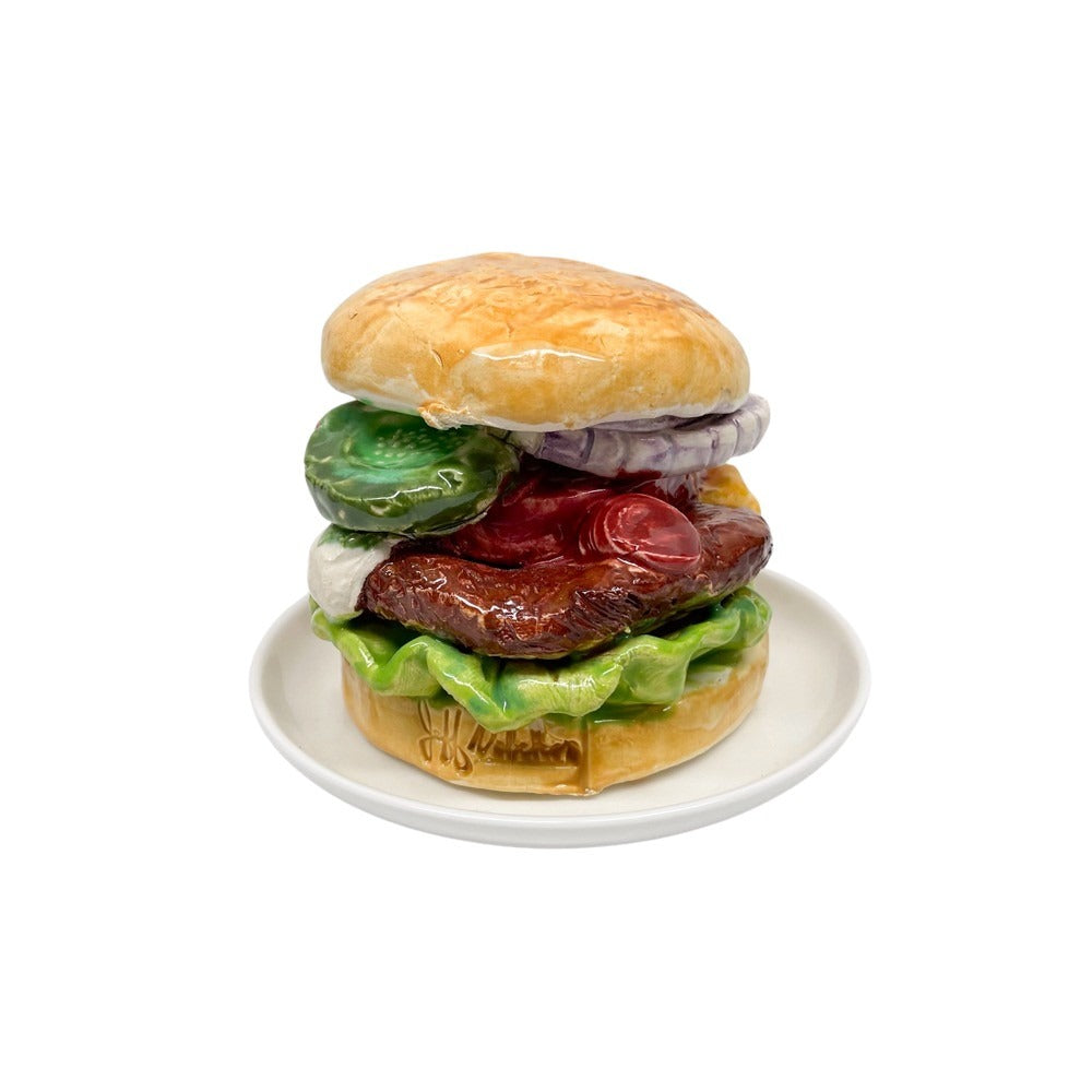 Jeff Nebeker's ceramic hamburger plates are hand made by the artist and are one-of-a-kind. The hamburger is sculpted out of clay and affixed to commercial dish ware. This piece is meant to be displayed on a flat surface.
