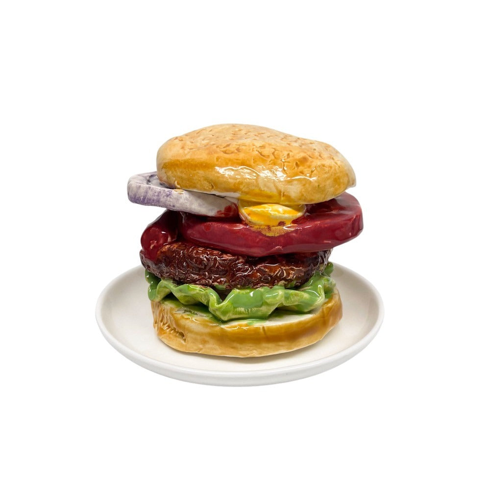 Jeff Nebeker's ceramic hamburger plates are hand made by the artist and are one-of-a-kind. The hamburger is sculpted out of clay and affixed to commercial dish ware. This piece is meant to be displayed on a flat surface.