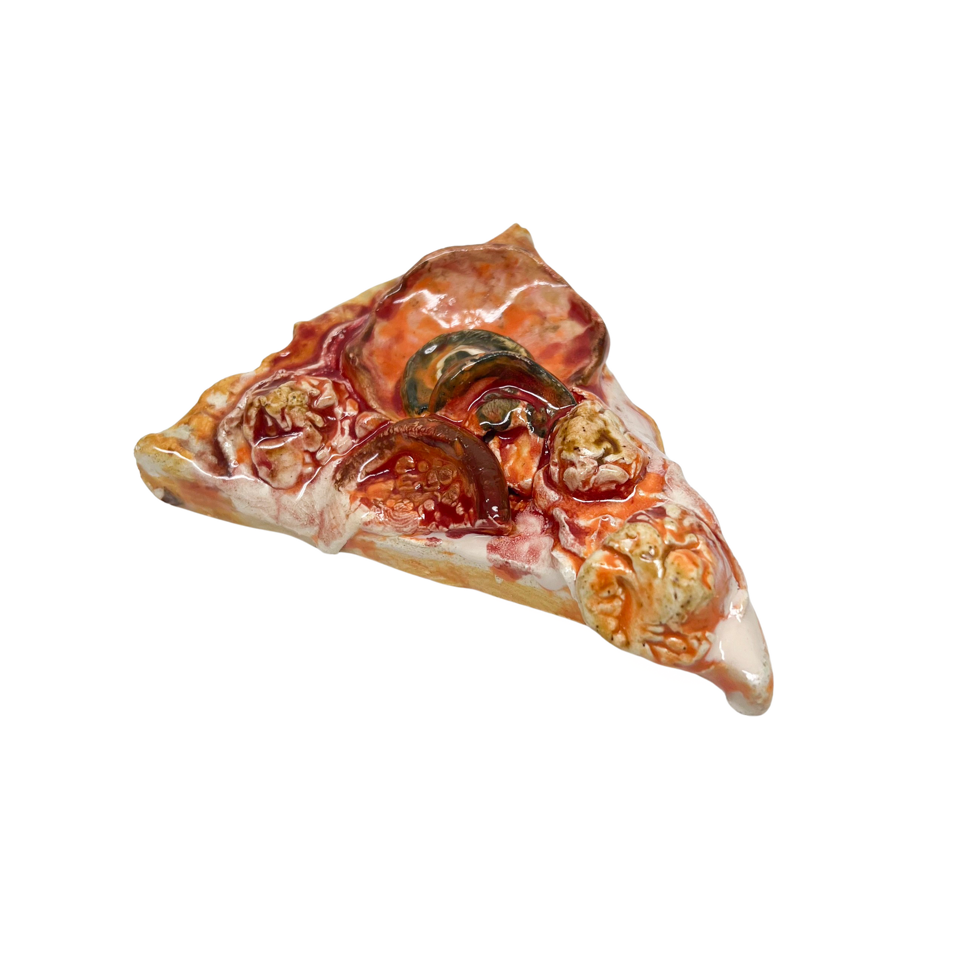 Jeff Nebeker's ceramic pizza slices are hand made by the artist and are one-of-a-kind. Plated pizza slices are affixed to commercial dish ware and are meant to be displayed on a flat surface. Loose pizza slices have a hanger on the back so they can either be hung on the wall or displayed flat.