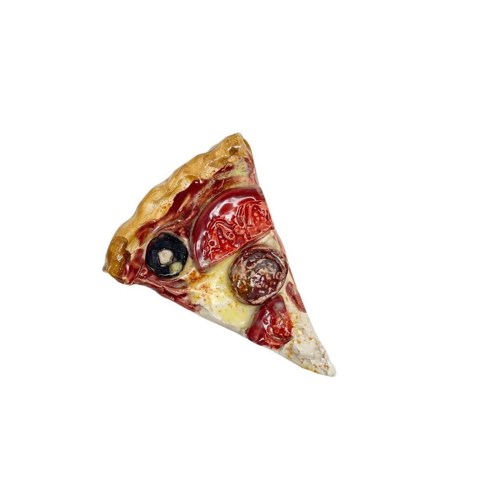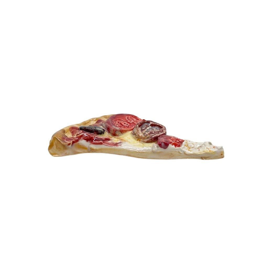 Jeff Nebeker's ceramic pizza slices are hand made by the artist and are one-of-a-kind. Plated pizza slices are affixed to commercial dish ware and are meant to be displayed on a flat surface. Loose pizza slices have a hanger on the back so they can either be hung on the wall or displayed flat.