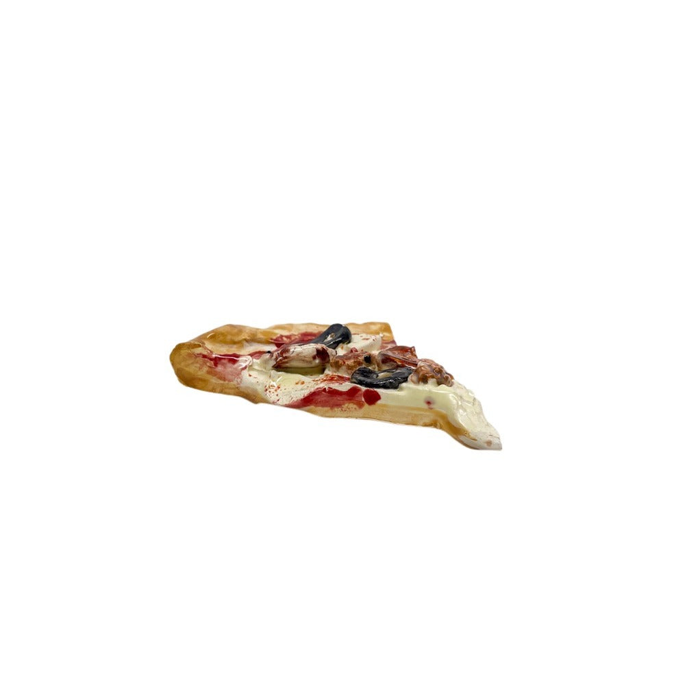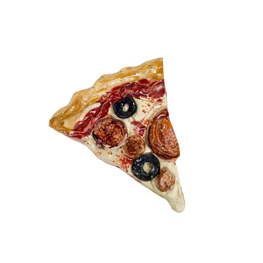 Jeff Nebeker's ceramic pizza slices are hand made by the artist and are one-of-a-kind. Plated pizza slices are affixed to commercial dish ware and are meant to be displayed on a flat surface. Loose pizza slices have a hanger on the back so they can either be hung on the wall or displayed flat.