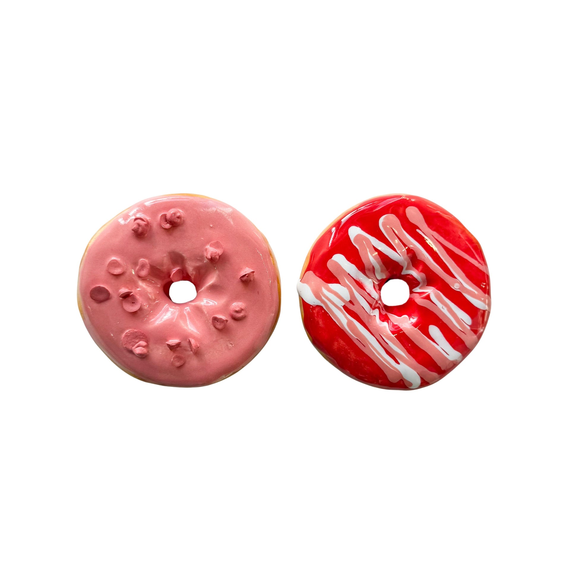 Jeff Nebeker's ceramic donuts are hand made by the artist, are one-of-a-kind, and may vary slightly from the picture. Each donut is stamped with the artist's signature and has a metal hanger glued to the back so it can easily be hung on a wall or displayed flat.