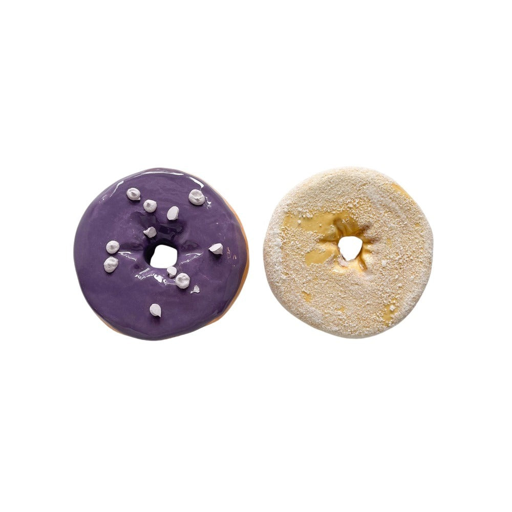 Jeff Nebeker's ceramic donuts are hand made by the artist, are one-of-a-kind, and may vary slightly from the picture. Each donut is stamped with the artist's signature and has a metal hanger glued to the back so it can easily be hung on a wall or displayed flat.