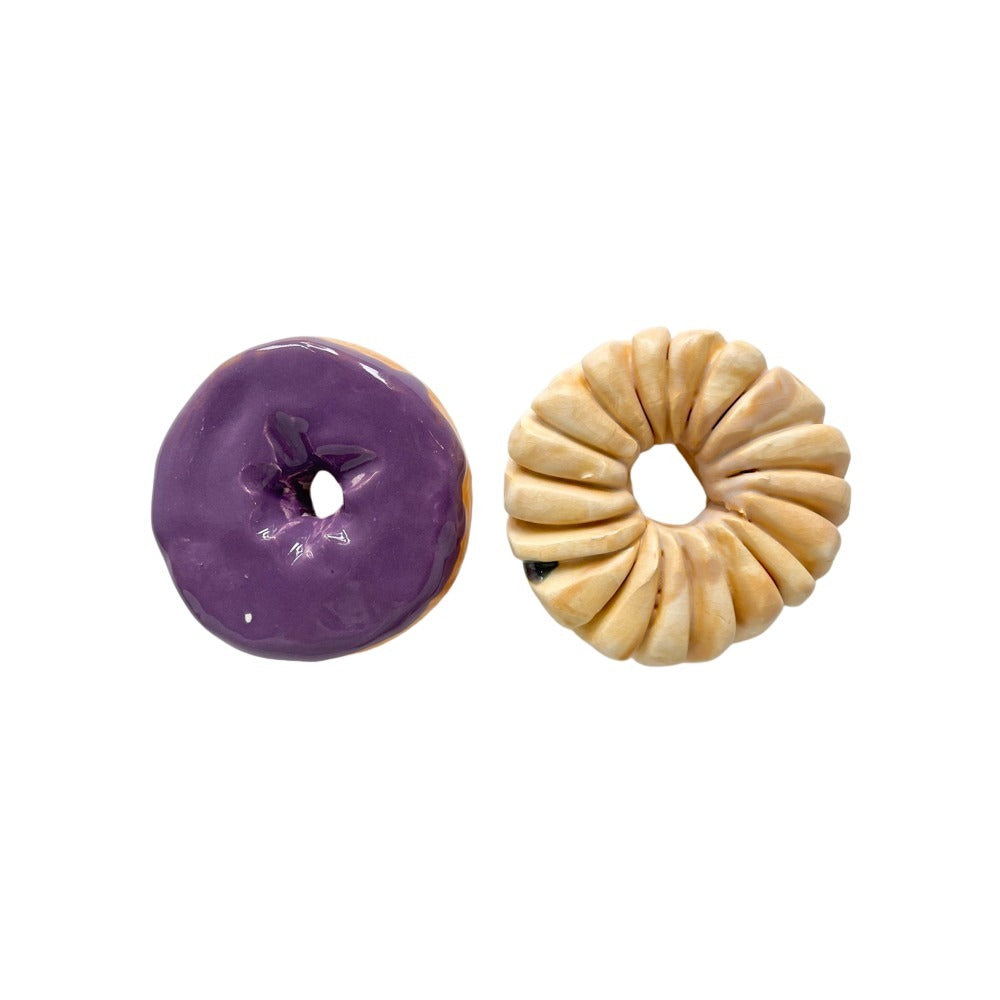 Jeff Nebeker's ceramic donuts are hand made by the artist, are one-of-a-kind, and may vary slightly from the picture. Each donut is stamped with the artist's signature and has a metal hanger glued to the back so it can easily be hung on a wall or displayed flat.