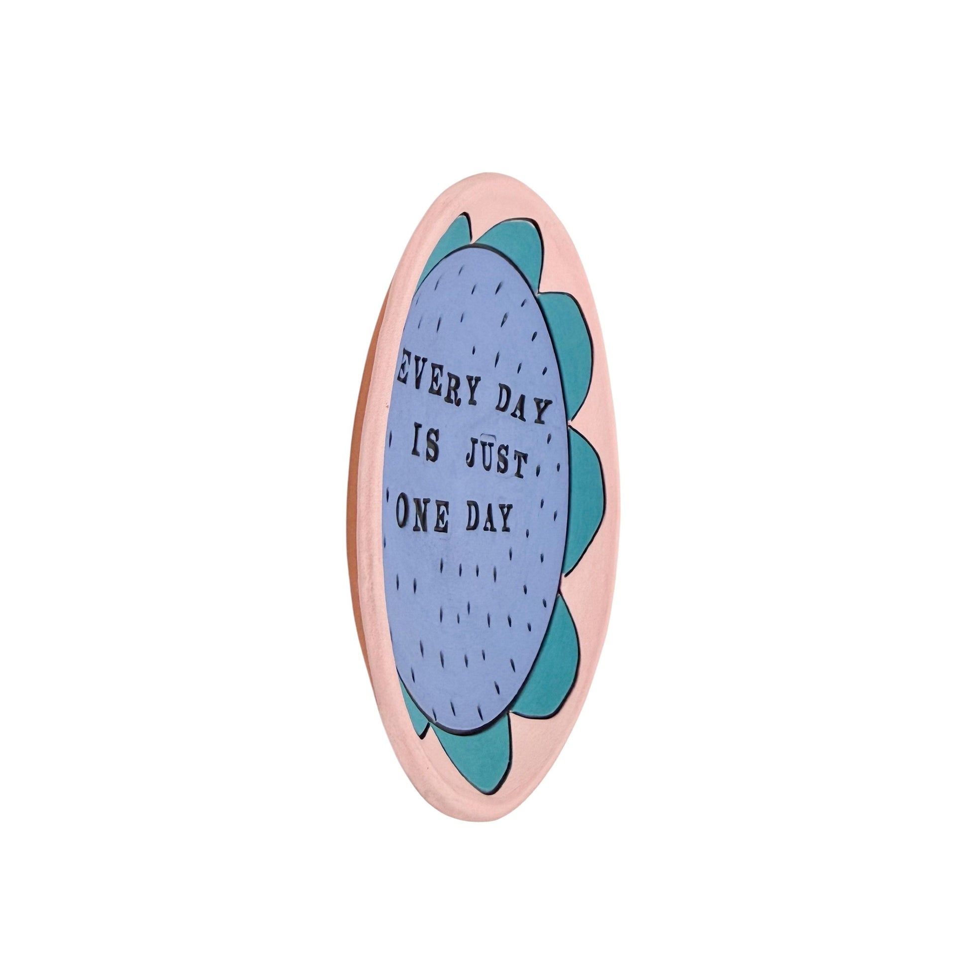Leslie Jenner's dishes are hand built from earthy terracotta clay, finished with a colorful matte underglaze. Each piece is decorated with unique quotes, sayings, and designs, making every piece one-of-a-kind. These are for decorative purposes only and are not intended for food use. Each piece comes with a hanger on the back for easy wall display. Due to their handmade nature, slight variations in size, color, and shape may occur.