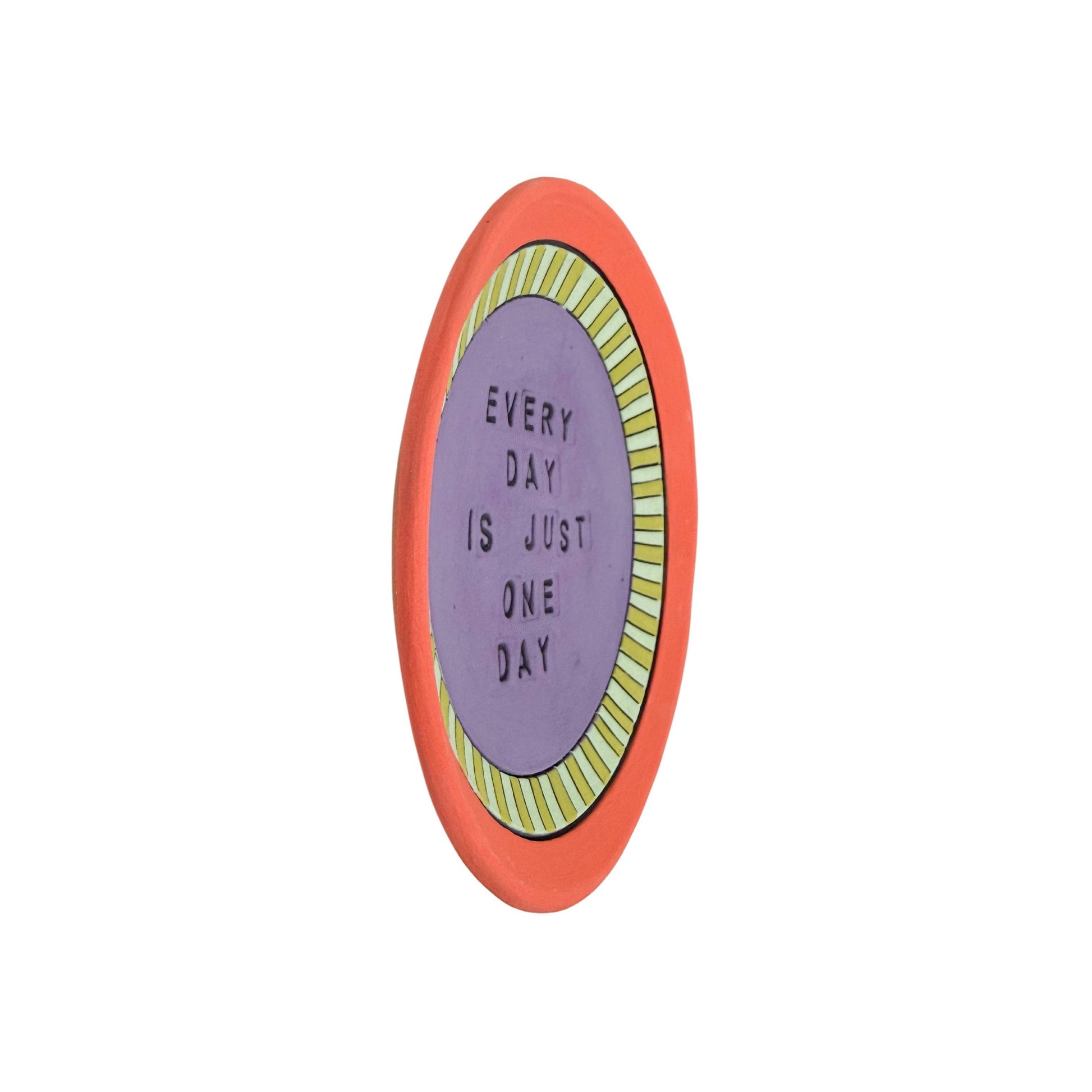 Leslie Jenner's dishes are hand built from earthy terracotta clay, finished with a colorful matte underglaze. Each piece is decorated with unique quotes, sayings, and designs, making every piece one-of-a-kind. These are for decorative purposes only and are not intended for food use. Each piece comes with a hanger on the back for easy wall display. Due to their handmade nature, slight variations in size, color, and shape may occur.