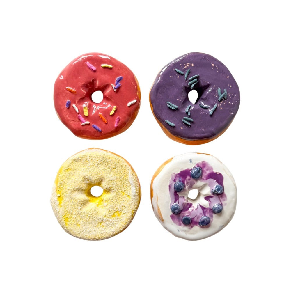 Jeff Nebeker's ceramic donuts are hand made by the artist, are one-of-a-kind, and may vary slightly from the picture. Each donut is stamped with the artist's signature and has a metal hanger glued to the back so it can easily be hung on a wall or displayed flat.