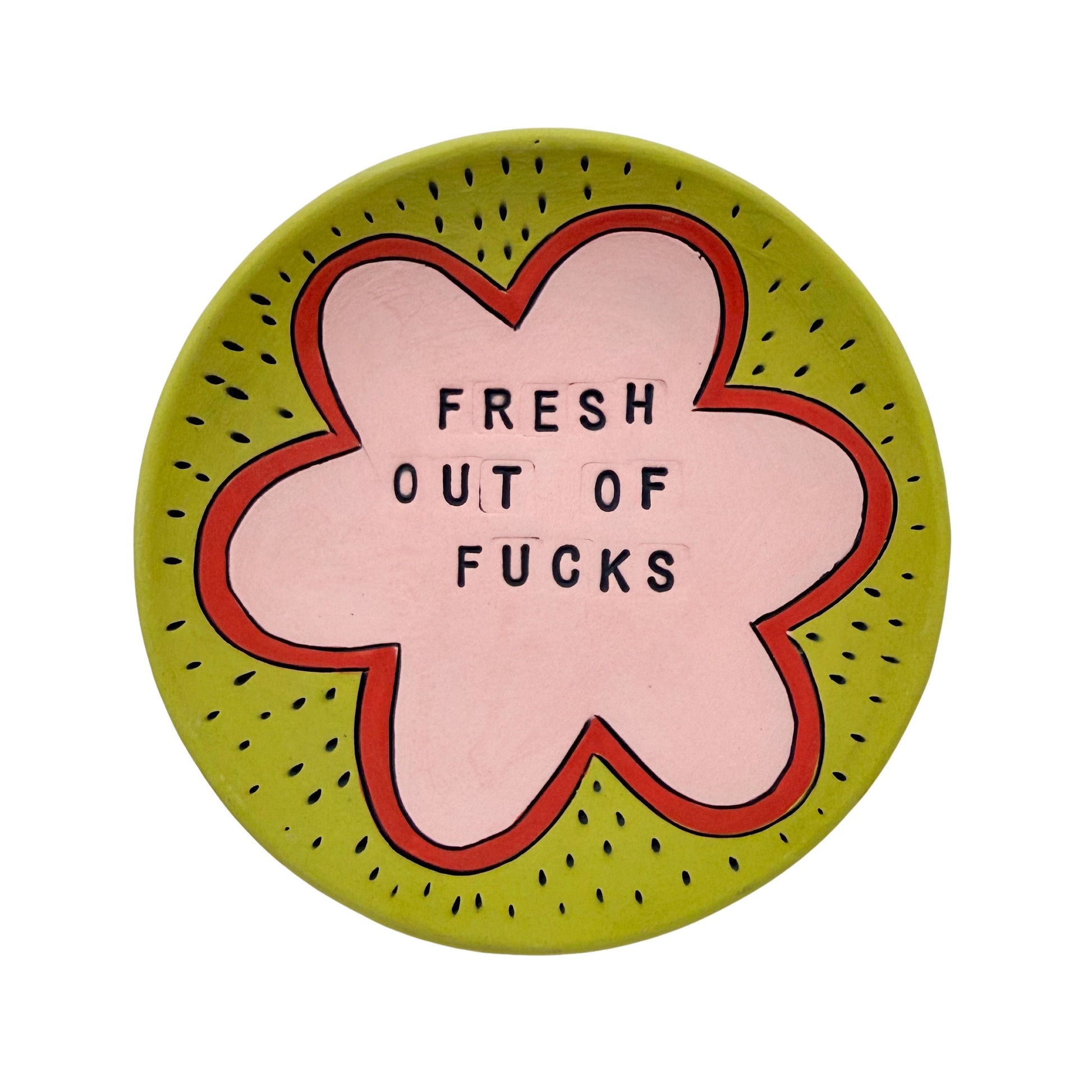 Leslie Jenner's dishes are hand built from earthy terracotta clay, finished with a colorful matte underglaze. Each piece is decorated with unique quotes, sayings, and designs, making every piece one-of-a-kind. These are for decorative purposes only and are not intended for food use. Each piece comes with a hanger on the back for easy wall display. Due to their handmade nature, slight variations in size, color, and shape may occur.