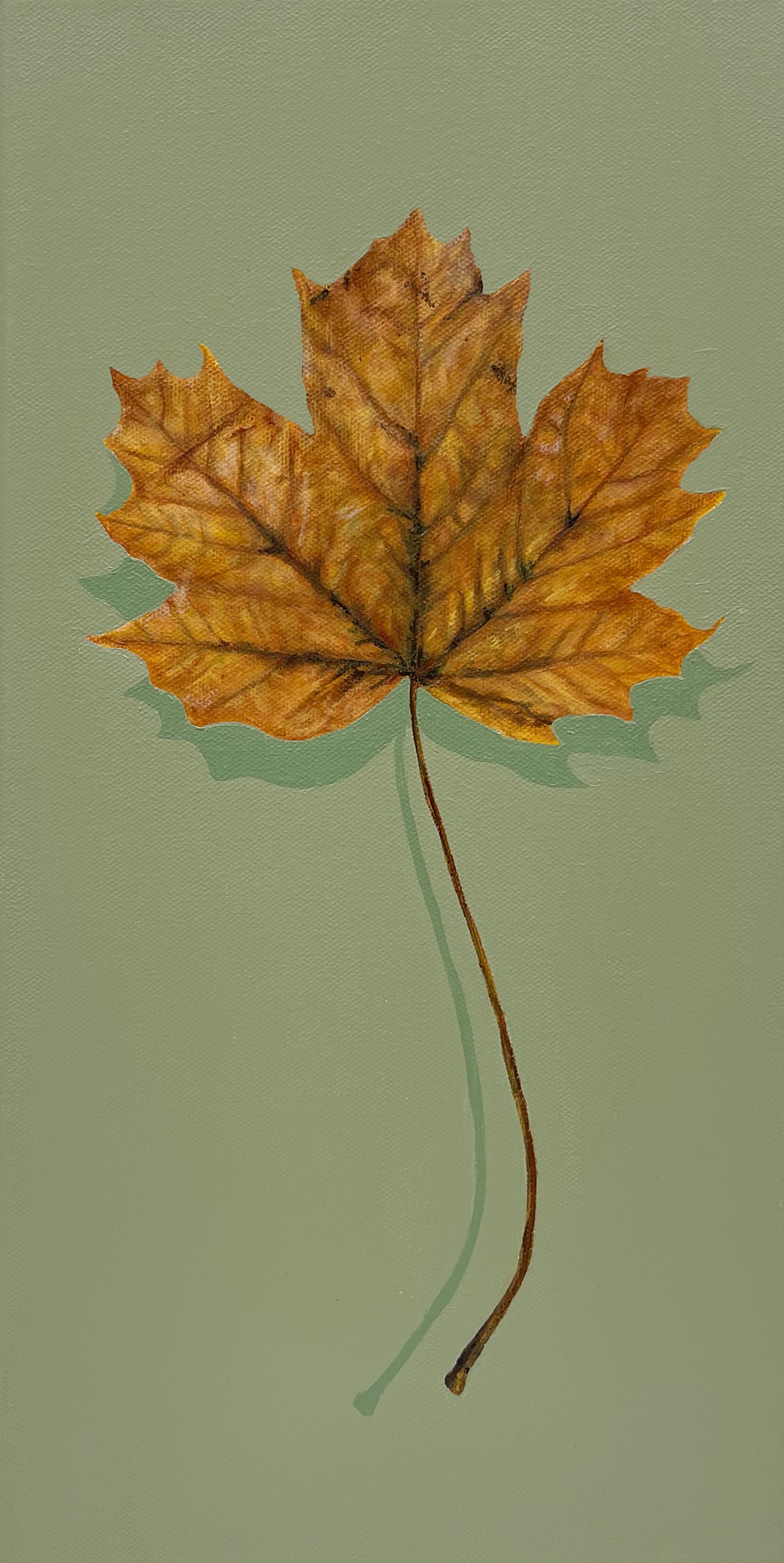 This original leaf painting by Gretchen Scheidt pairs realistic detail with a solid, graphic background for a striking, modern composition. Inspired by the natural wear and history of each leaf, the work reflects themes of resilience, transformation, and the beauty found in imperfection.