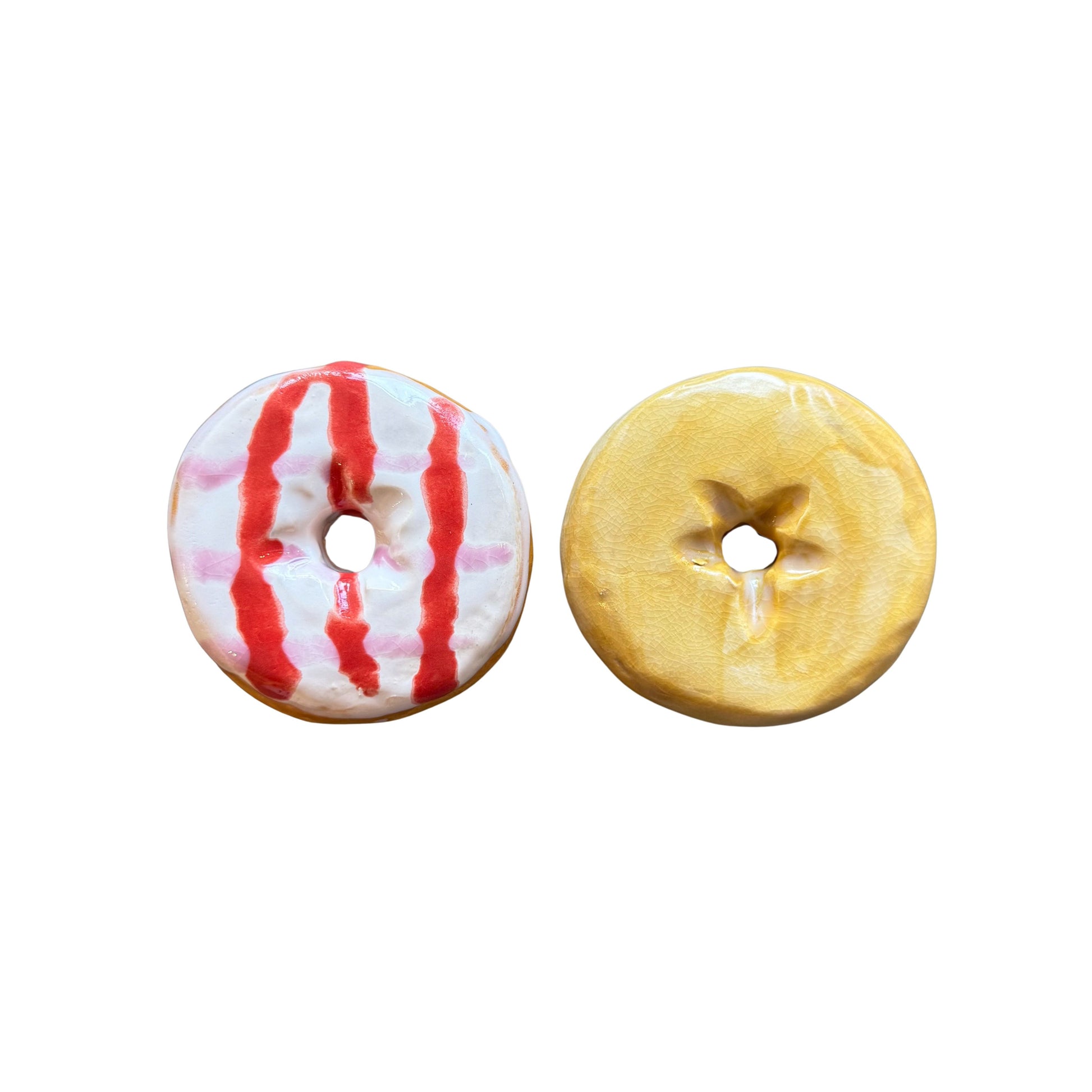 Jeff Nebeker's ceramic donuts are hand made by the artist, are one-of-a-kind, and may vary slightly from the picture. Each donut is stamped with the artist's signature and has a metal hanger glued to the back so it can easily be hung on a wall or displayed flat.