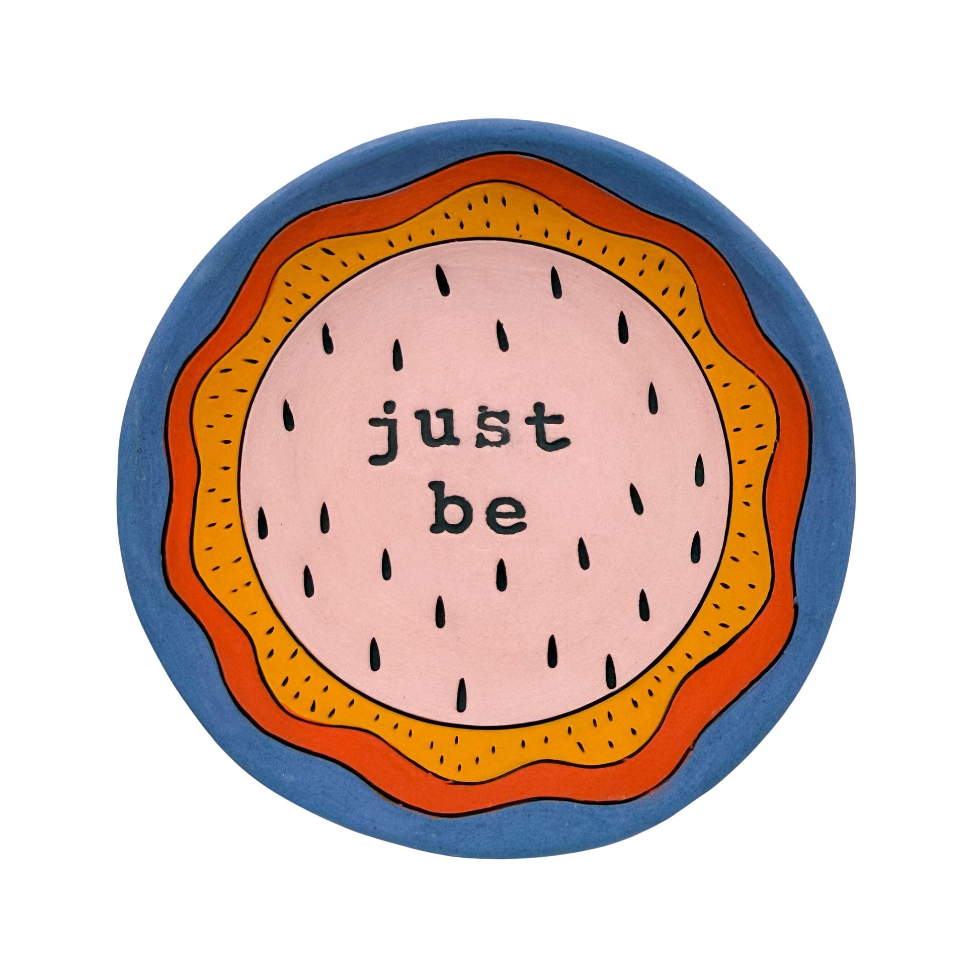 Leslie Jenner's dishes are hand built from earthy terracotta clay, finished with a colorful matte underglaze. Each piece is decorated with unique quotes, sayings, and designs, making every piece one-of-a-kind. These are for decorative purposes only and are not intended for food use. Each piece comes with a hanger on the back for easy wall display. Due to their handmade nature, slight variations in size, color, and shape may occur.