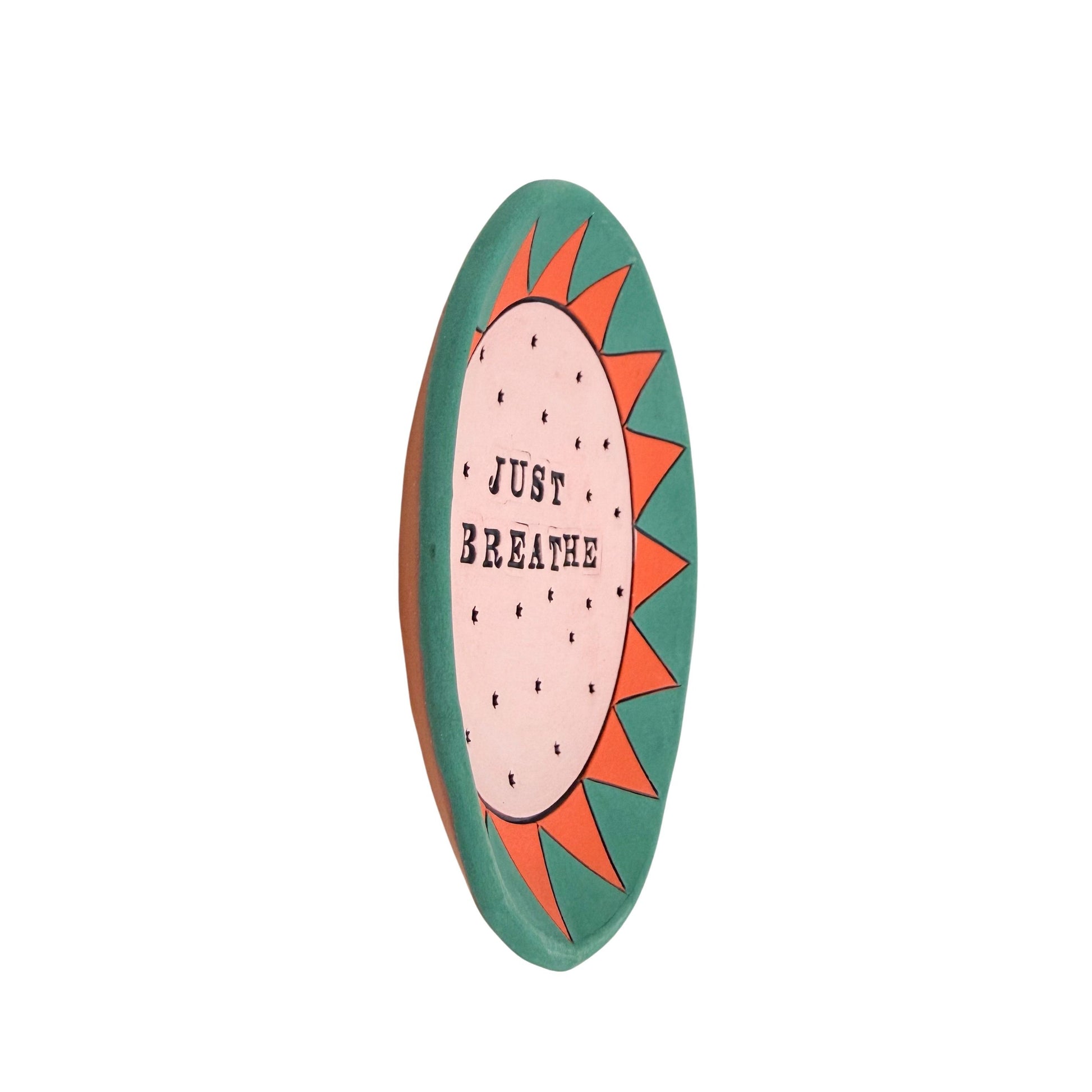 Leslie Jenner's dishes are hand built from earthy terracotta clay, finished with a colorful matte underglaze. Each piece is decorated with unique quotes, sayings, and designs, making every piece one-of-a-kind. These are for decorative purposes only and are not intended for food use. Each piece comes with a hanger on the back for easy wall display. Due to their handmade nature, slight variations in size, color, and shape may occur.