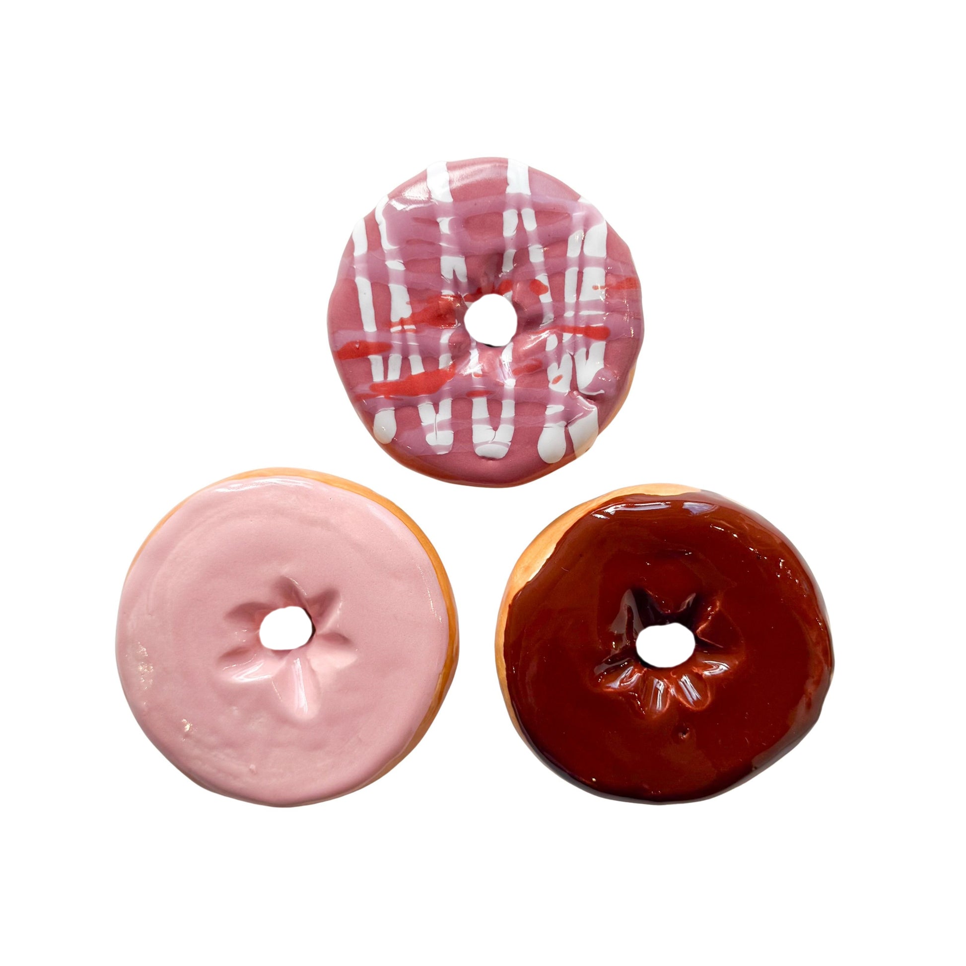Jeff Nebeker's ceramic donuts are hand made by the artist, are one-of-a-kind, and may vary slightly from the picture. Each donut is stamped with the artist's signature and has a metal hanger glued to the back so it can easily be hung on a wall or displayed flat.