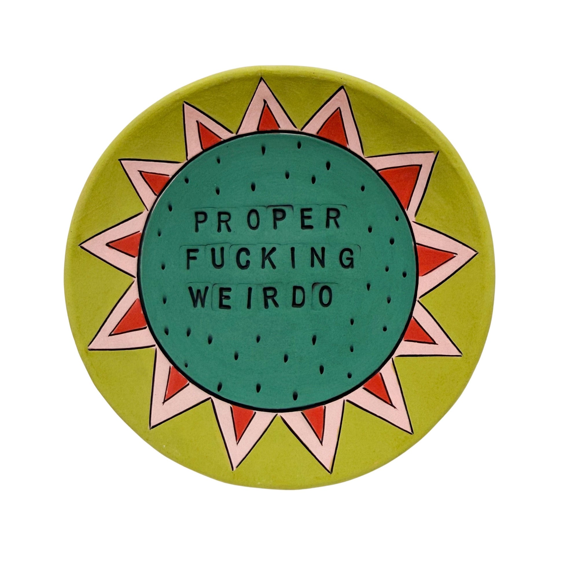 Leslie Jenner's dishes are hand built from earthy terracotta clay, finished with a colorful matte underglaze. Each piece is decorated with unique quotes, sayings, and designs, making every piece one-of-a-kind. These are for decorative purposes only and are not intended for food use. Each piece comes with a hanger on the back for easy wall display. Due to their handmade nature, slight variations in size, color, and shape may occur.