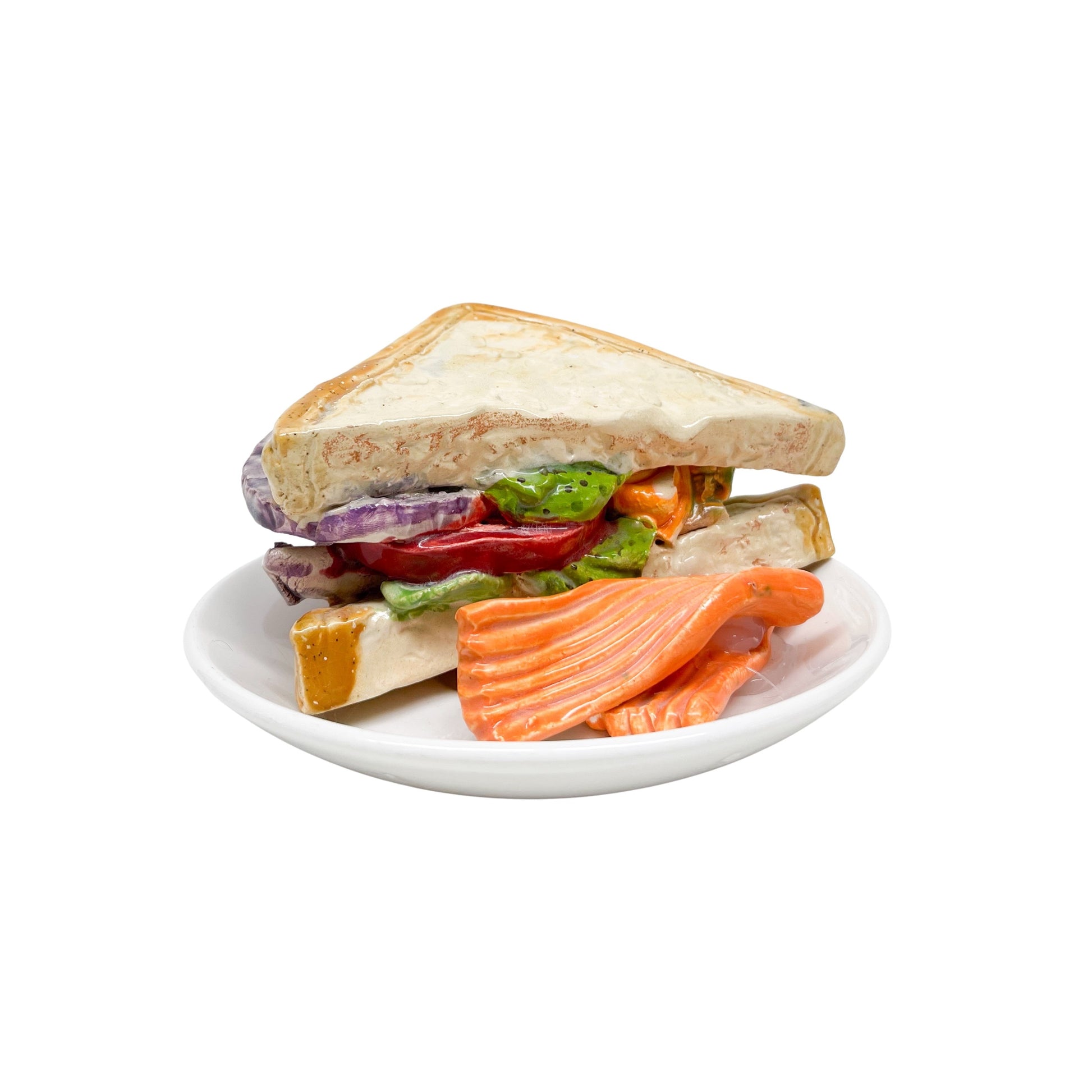 Jeff Nebeker's ceramic sandwiches are hand made by the artist and one-of-a-kind. The sandwich is sculpted out of clay and affixed to commercial dish ware. This piece is meant to be displayed on a flat surface.