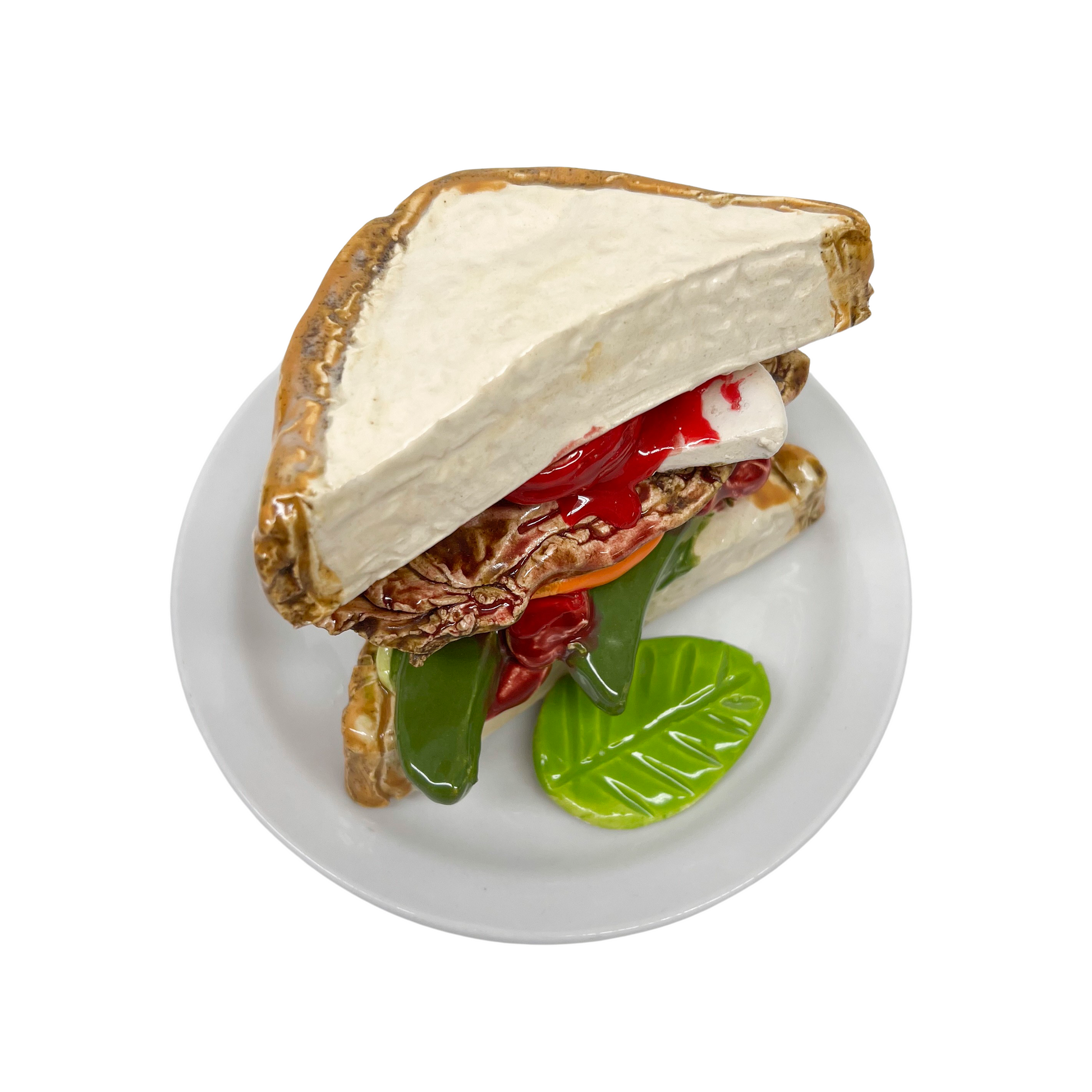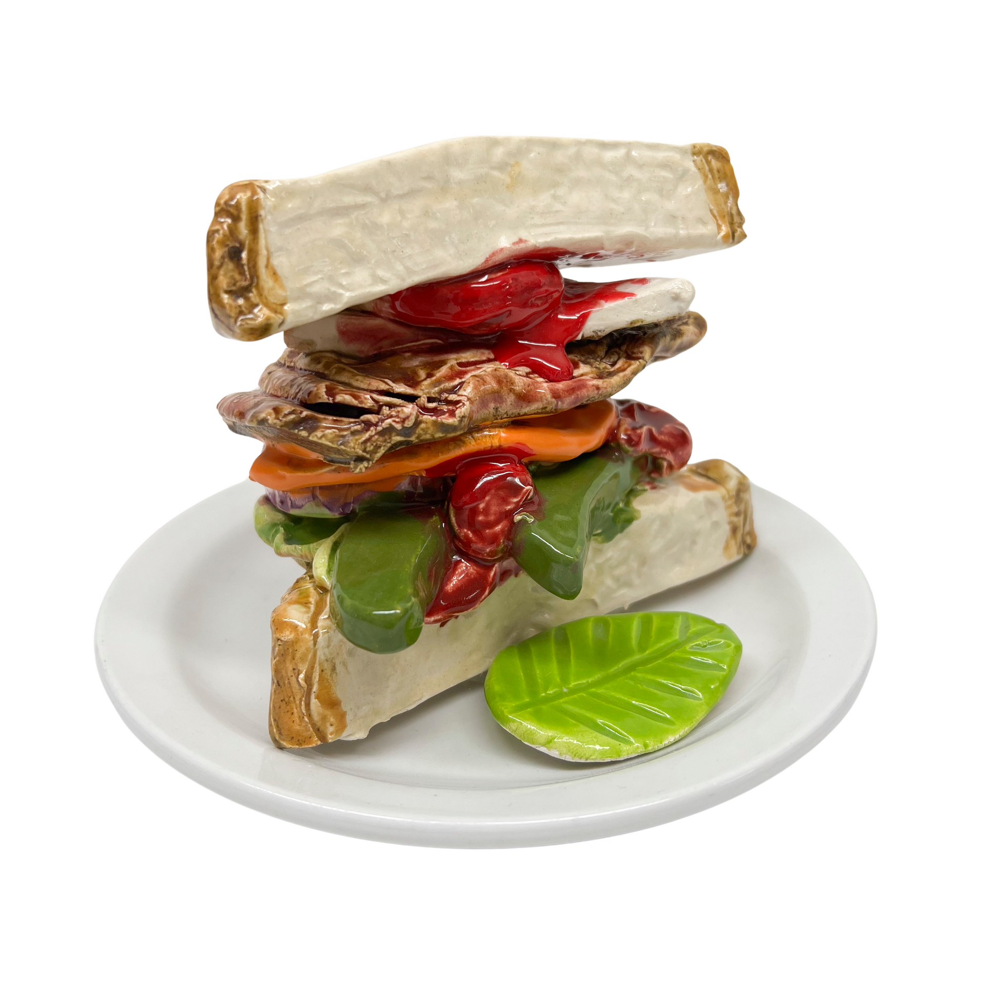 Jeff Nebeker's ceramic sandwiches are hand made by the artist and one-of-a-kind. The sandwich is sculpted out of clay and affixed to commercial dish ware. This piece is meant to be displayed on a flat surface.