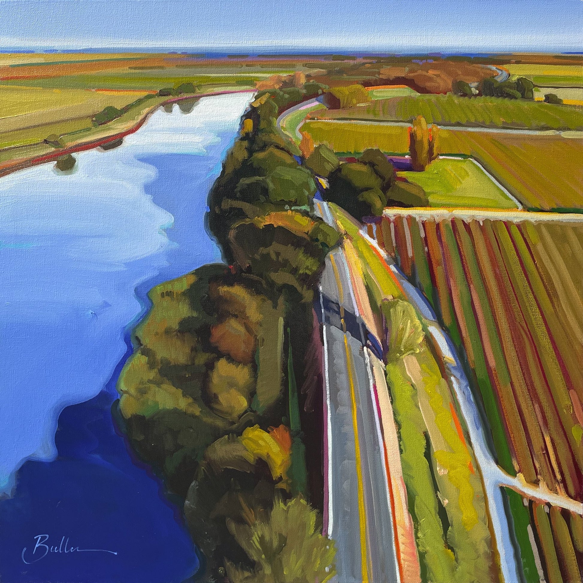 Sparkling Blue offers a fresh, light-filled take on the landscape, where cool tones and reflective surfaces create a sense of openness and movement. Samantha Buller’s aerial perspective highlights the rhythm of water and land, bringing a crisp, calming energy to the composition.