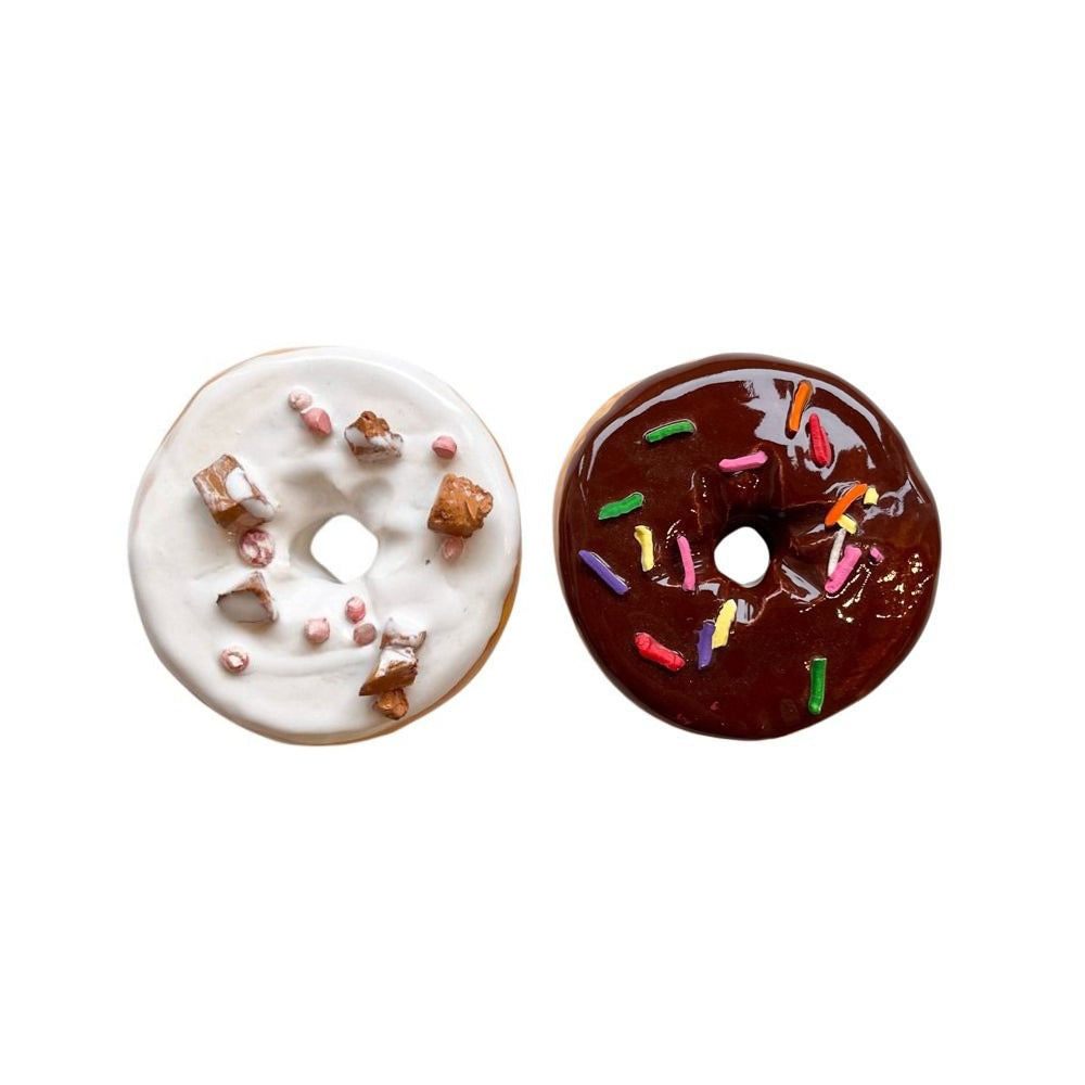 Jeff Nebeker's ceramic donuts are hand made by the artist, are one-of-a-kind, and may vary slightly from the picture. Each donut is stamped with the artist's signature and has a metal hanger glued to the back so it can easily be hung on a wall or displayed flat.