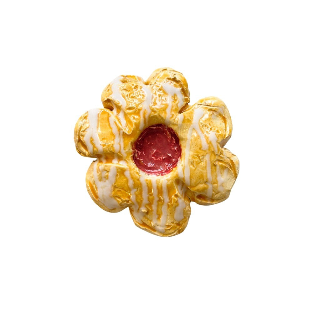 Jeff Nebeker's ceramic danishes are hand made by the artist, are one-of-a-kind, and may vary slightly from the picture. Each danish is stamped with the artist's signature and has a metal hanger glued to the back so it can easily be hung on a wall or displayed flat. For size reference, the danishes are larger than the donuts.