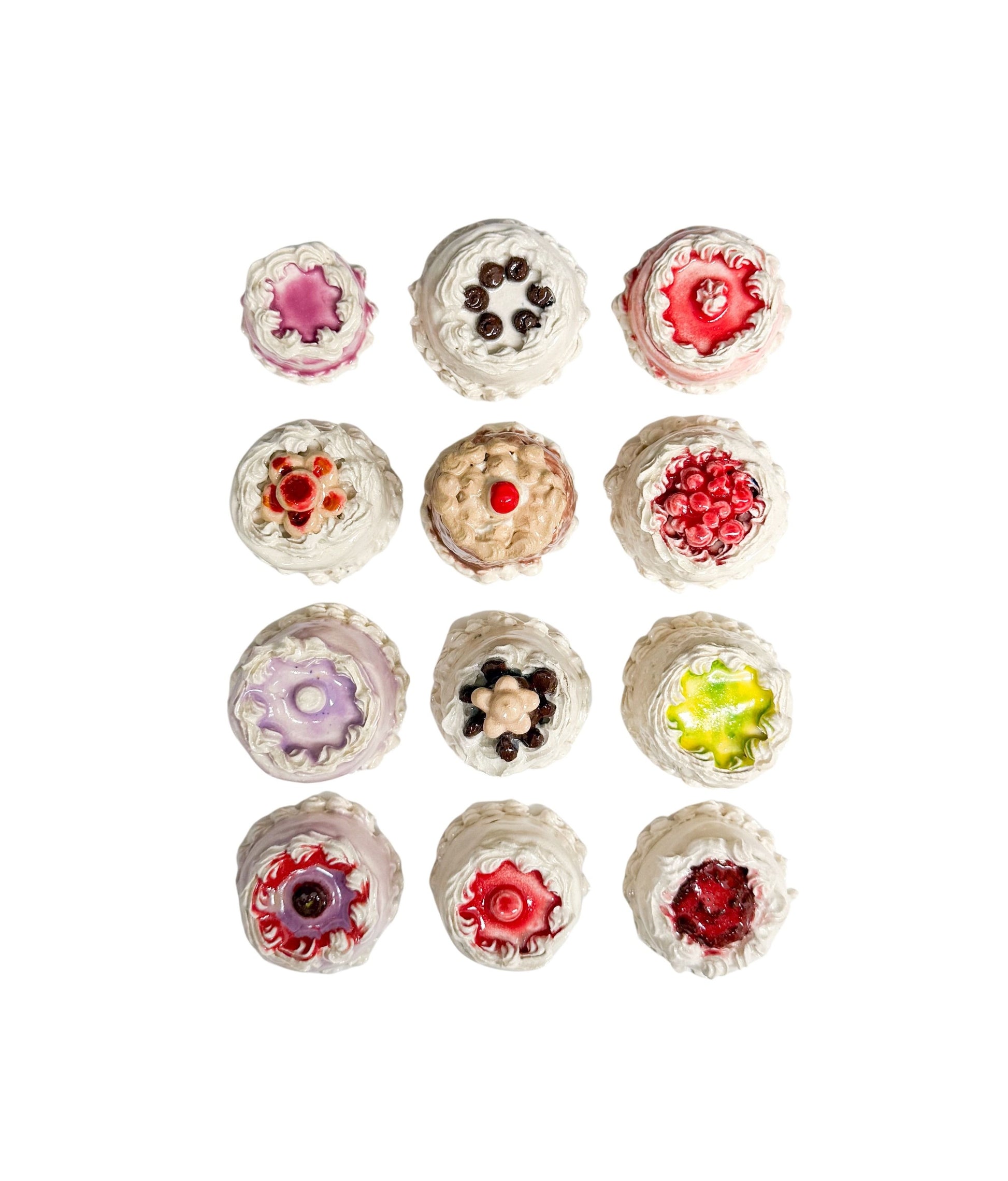 Each Surprise Tinest Cake includes one handcrafted cake by Jeff Nebeker. Every piece is one-of-a-kind, making it a fun and easy way to start collecting Jeff’s work—or to give as a playful gift to a new collector. These pieces are meant to be displayed flat but can have a hanger added to the back on request. Please note some of the Tinier Cakes cannot fit a hanger on the back.