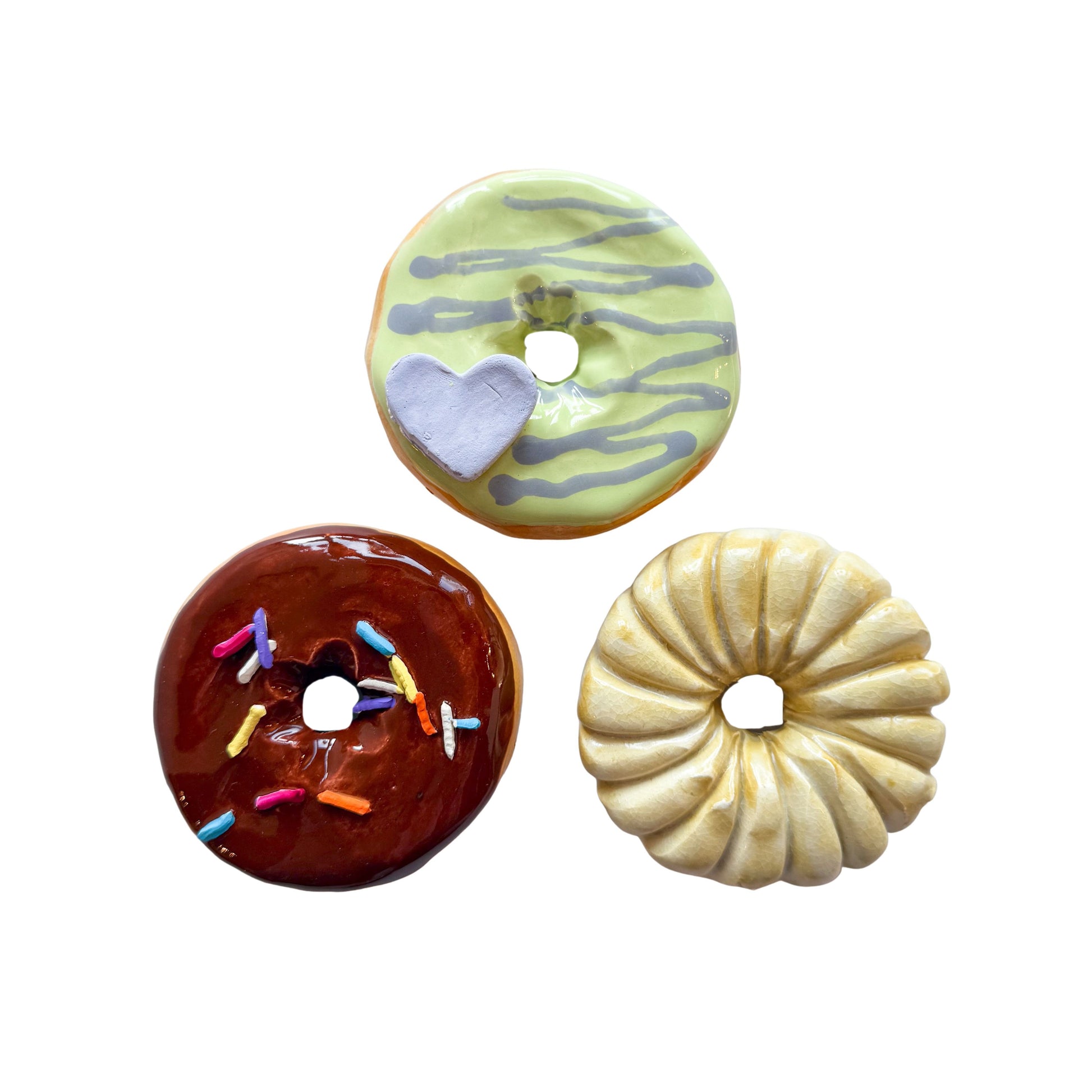 Jeff Nebeker's ceramic donuts are hand made by the artist, are one-of-a-kind, and may vary slightly from the picture. Each donut is stamped with the artist's signature and has a metal hanger glued to the back so it can easily be hung on a wall or displayed flat.