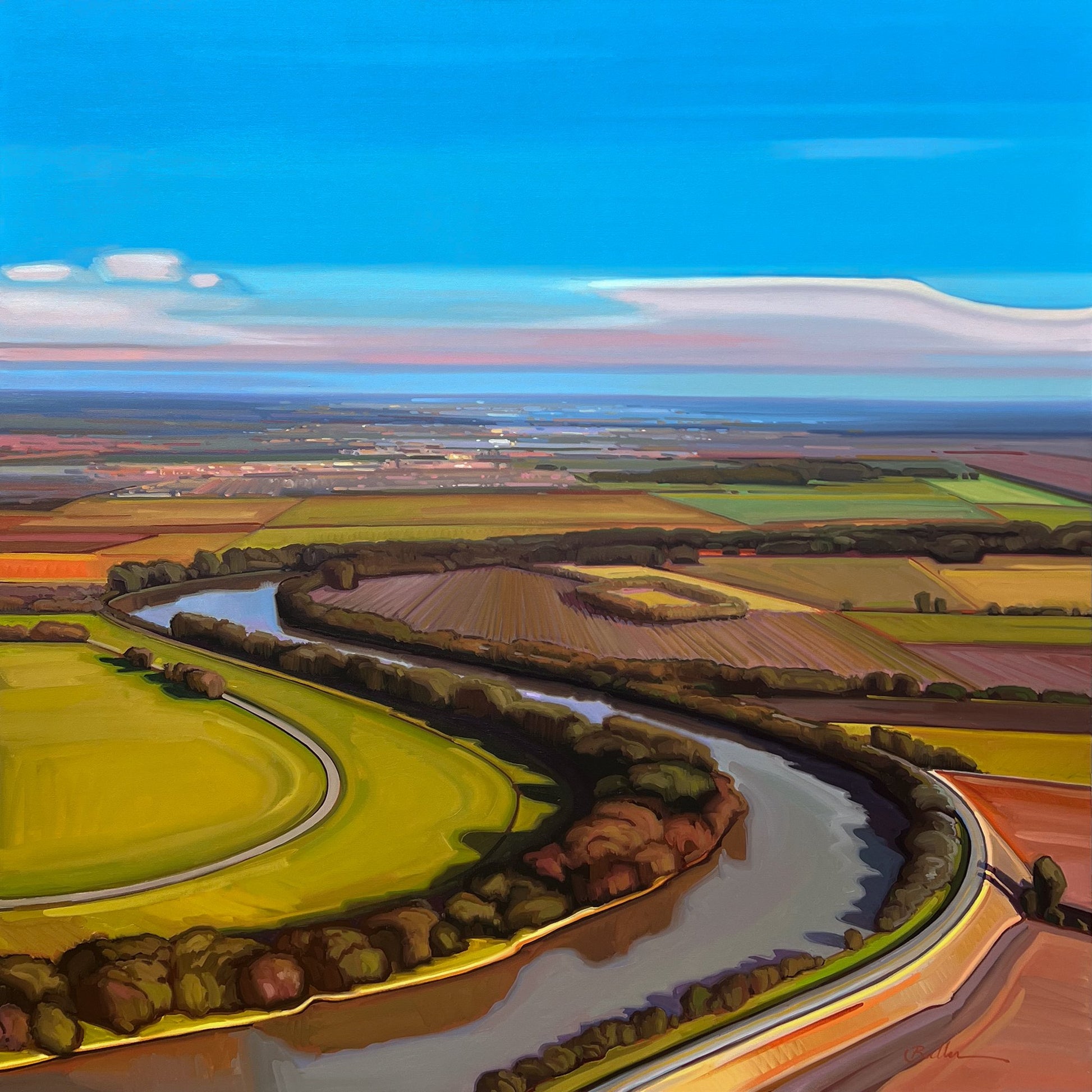 The City Beyond pulls the eye outward, where structured fields gradually give way to the edge of a distant city. Samantha Buller’s aerial perspective captures that meeting point between open landscape and urban life, balancing geometry, light, and subtle shifts in color.
