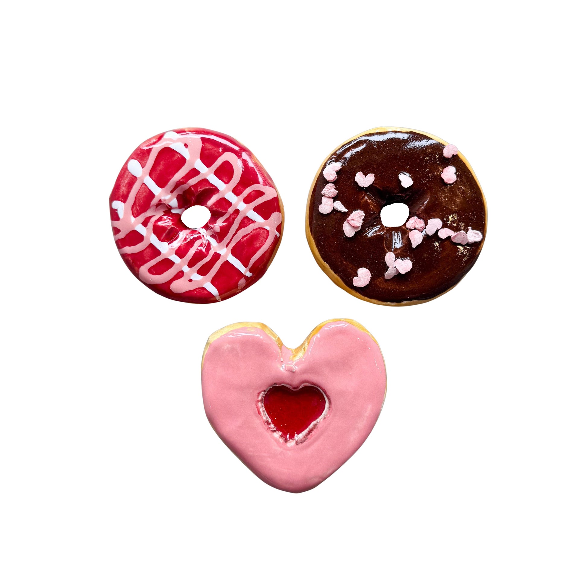 Jeff Nebeker's ceramic donuts are hand made by the artist, are one-of-a-kind, and may vary slightly from the picture. Each donut is stamped with the artist's signature and has a metal hanger glued to the back so it can easily be hung on a wall or displayed flat.