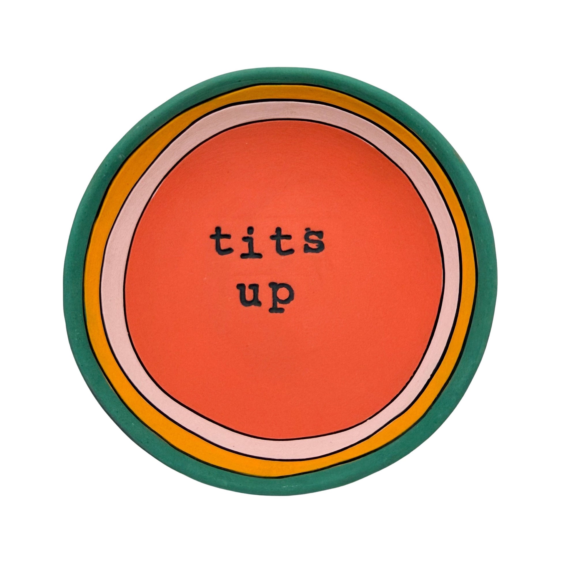 Leslie Jenner's dishes are hand built from earthy terracotta clay, finished with a colorful matte underglaze. Each piece is decorated with unique quotes, sayings, and designs, making every piece one-of-a-kind. These are for decorative purposes only and are not intended for food use. Each piece comes with a hanger on the back for easy wall display. Due to their handmade nature, slight variations in size, color, and shape may occur.