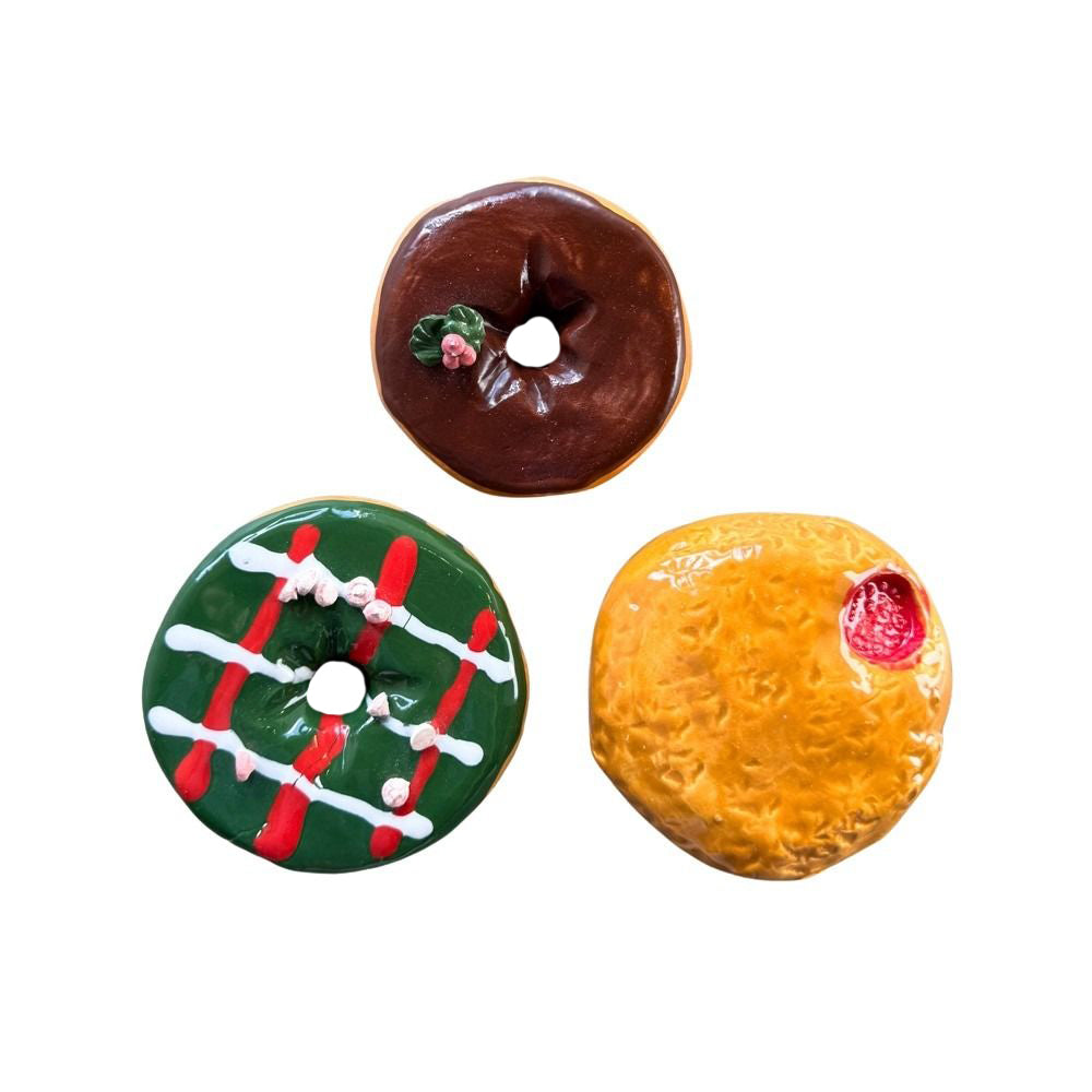 Jeff Nebeker's ceramic donuts are hand made by the artist, are one-of-a-kind, and may vary slightly from the picture. Each donut is stamped with the artist's signature and has a metal hanger glued to the back so it can easily be hung on a wall or displayed flat.