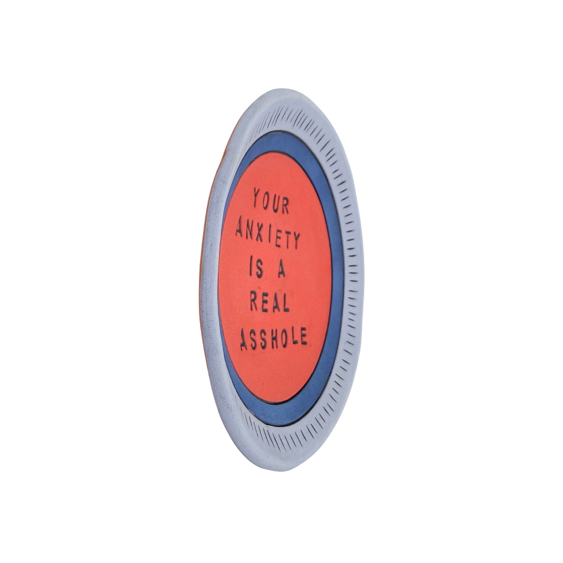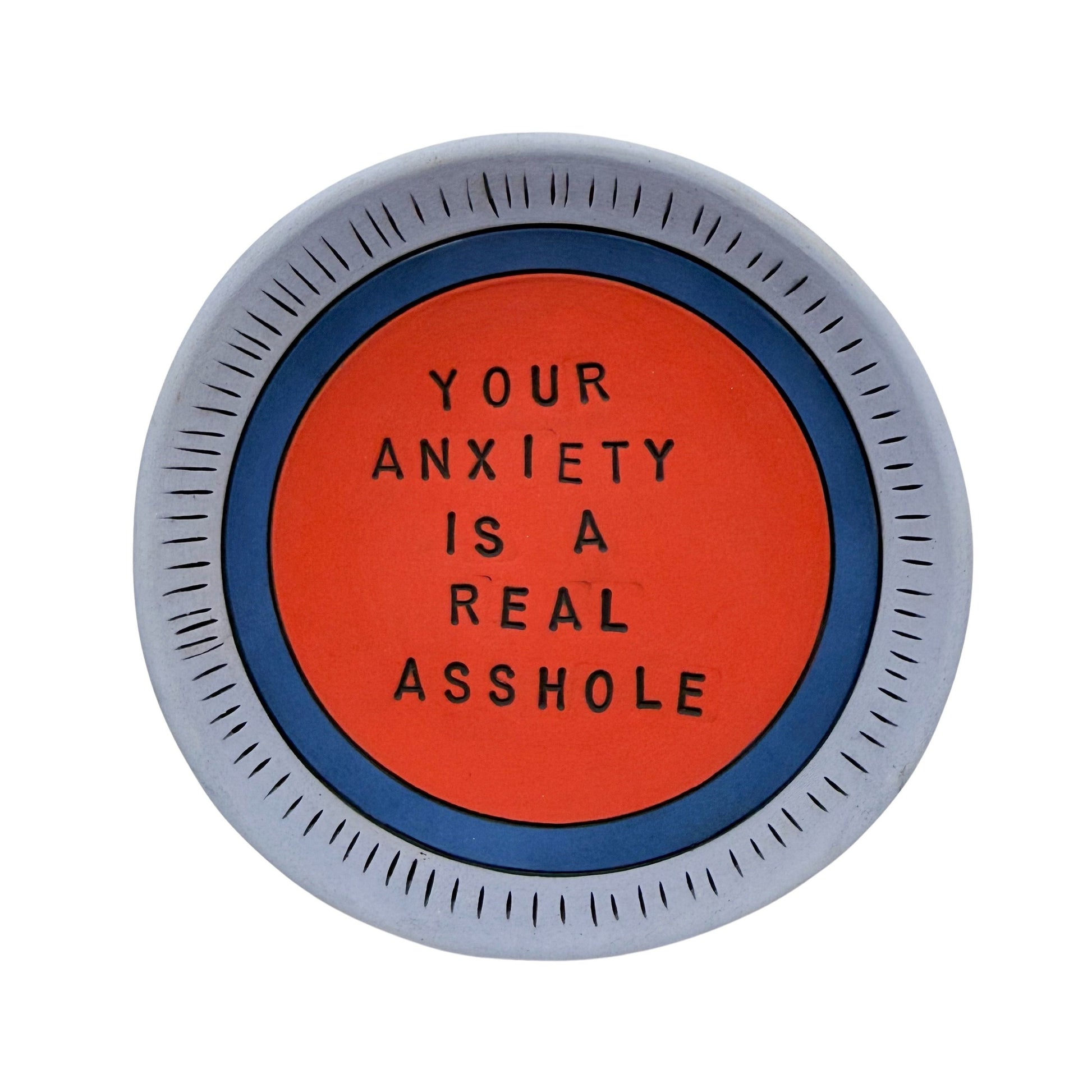 Leslie Jenner's dishes are hand built from earthy terracotta clay, finished with a colorful matte underglaze. Each piece is decorated with unique quotes, sayings, and designs, making every piece one-of-a-kind. These are for decorative purposes only and are not intended for food use. Each piece comes with a hanger on the back for easy wall display. Due to their handmade nature, slight variations in size, color, and shape may occur.